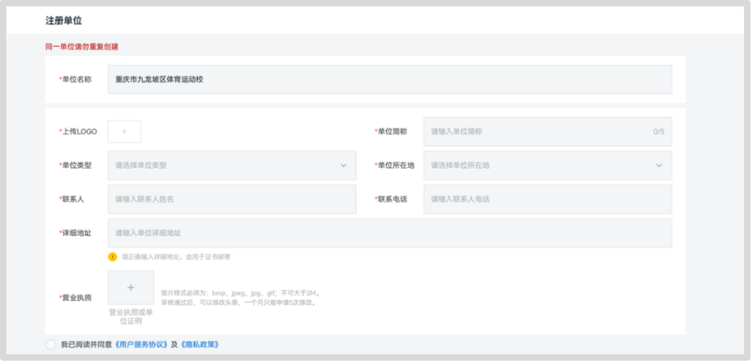 (二)在单位注册页面中,按要求填写信息,确认无误后点击“提交”。注:同一单位请勿重复注册!审核时将随机删除多余账号。