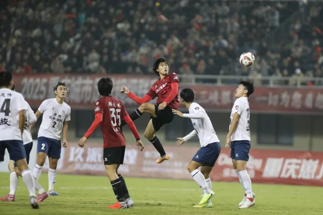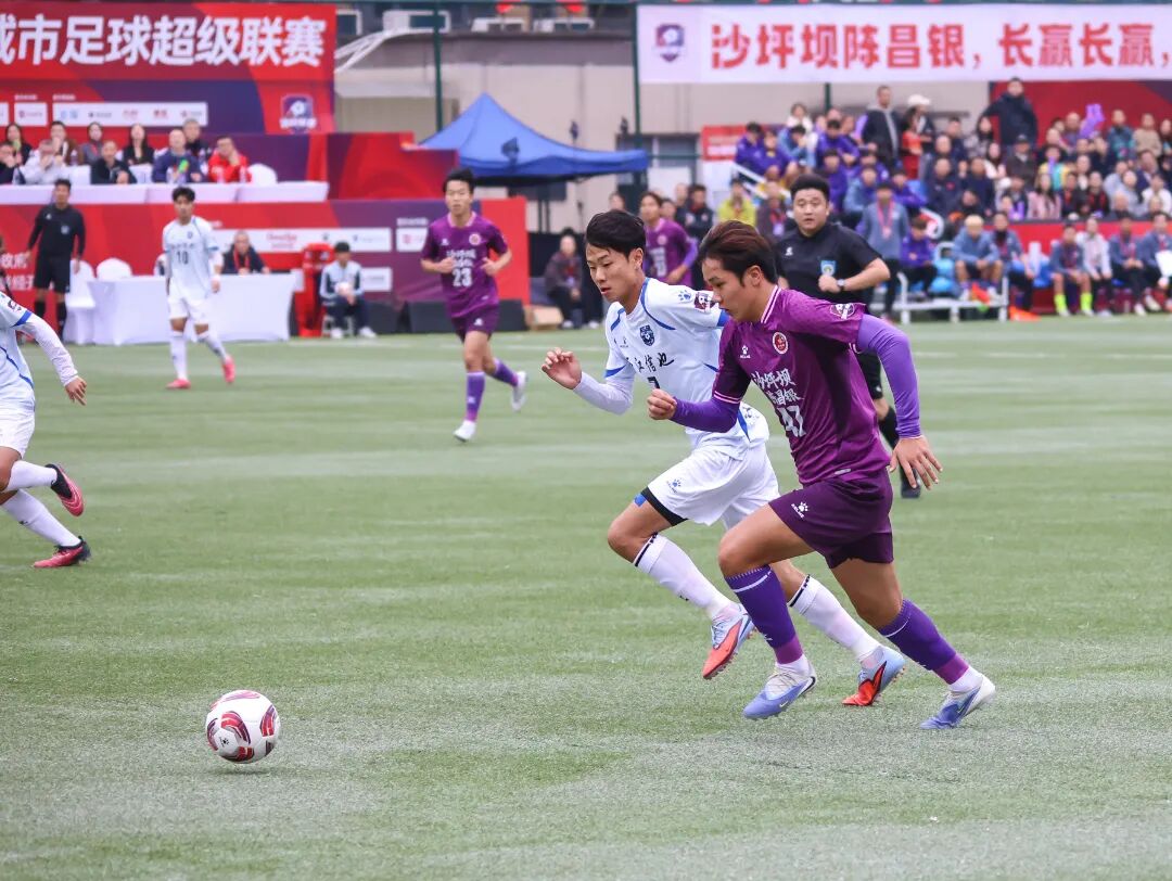 比赛进行到第17分钟,沙坪坝设计了巧妙的角球战术,11号球员李哲镐头球破门,帮助球队1:0领先。下半场第52分钟,沙坪坝7号球员罗伟宸禁区内接队友传球,虽然射门时右脚没能吃准部位,但皮球歪打正着击中右侧立柱后滚入球门,场上比分变成2:0。第76分钟,沙坪坝29号球员王俊轶中路接队友右侧传中,轻松头球破门,将比分锁定为3:0。