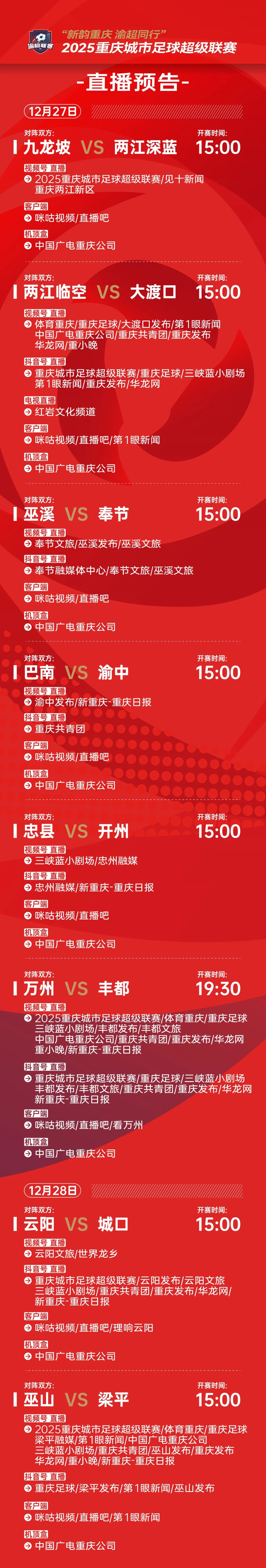 直播预告 | 2025重庆城市足球超级联赛(12.27-12.28)