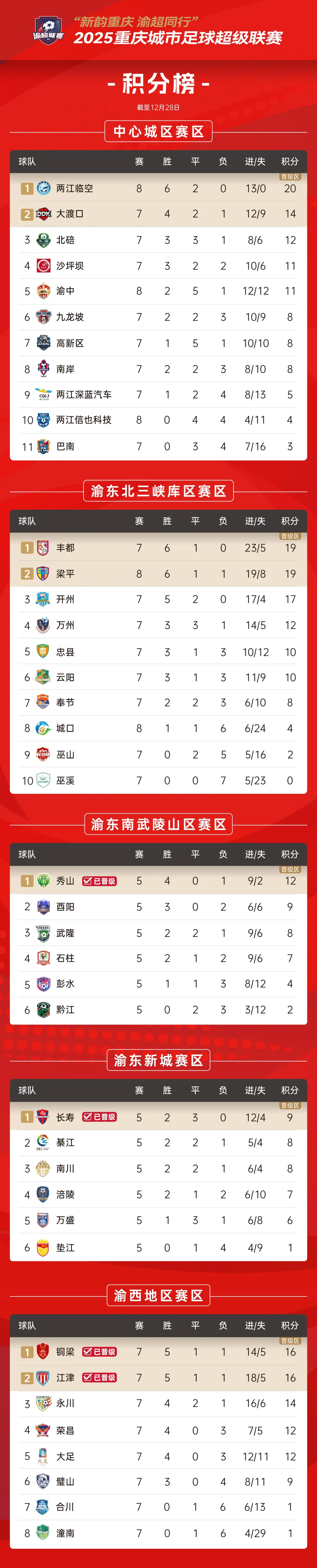 渝超联赛积分榜(截至12月28日)