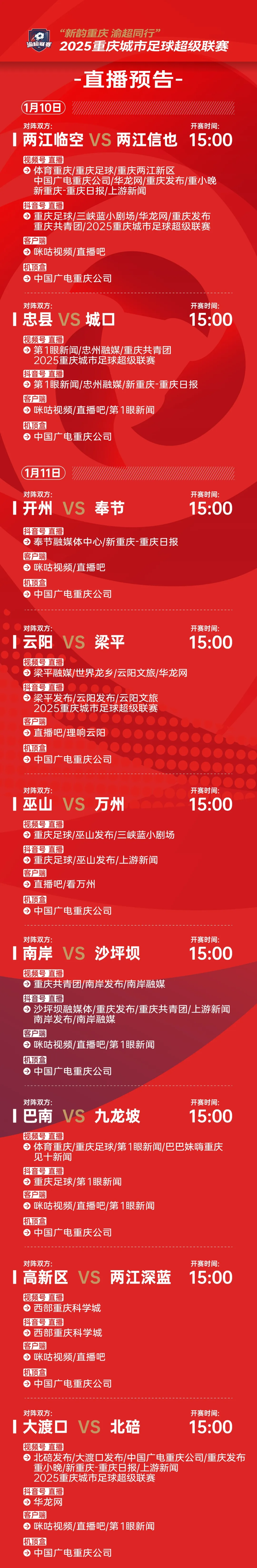 直播预告 | 2025重庆城市足球超级联赛(1.10-1.11)