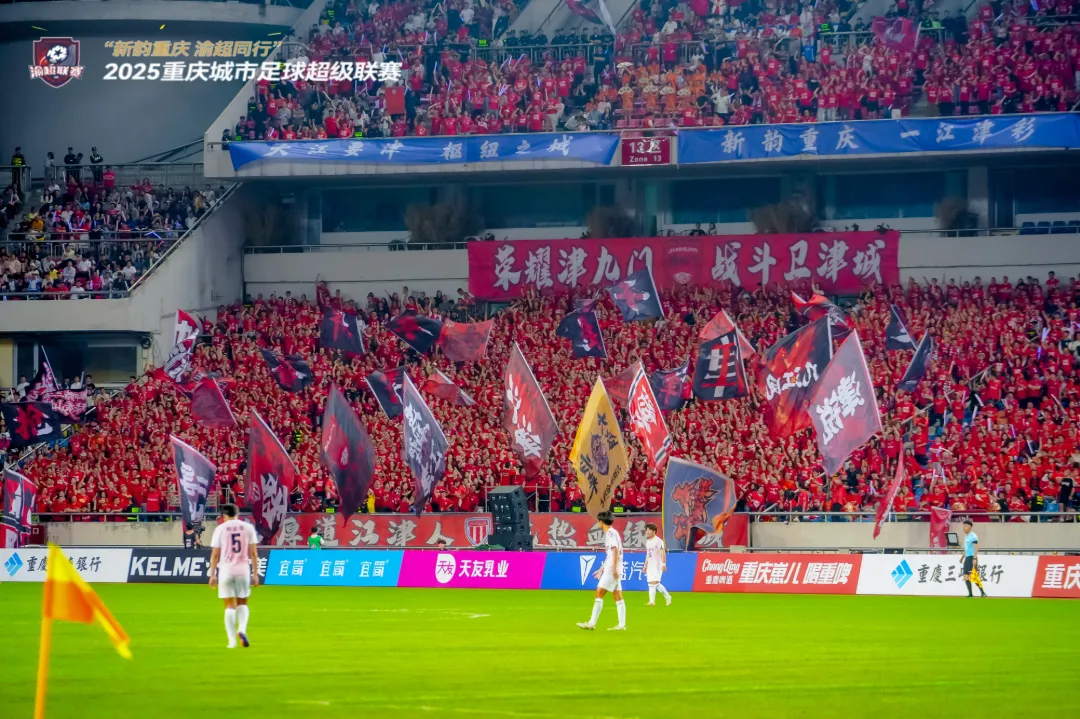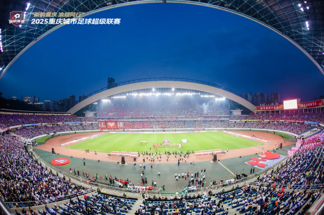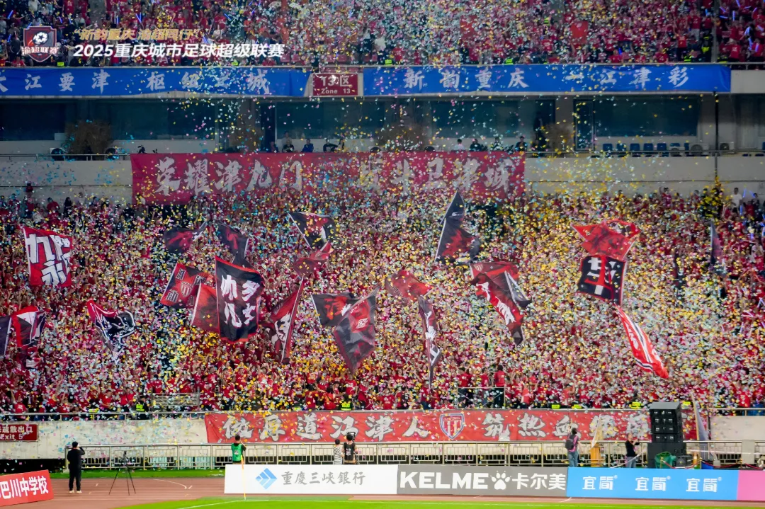 当球员与球童入场时,看台上双方球迷同时展开巨幅tifo,重庆奥体中心瞬间被点燃,成为一座沸腾的足球圣殿。