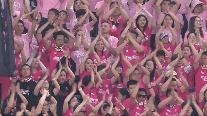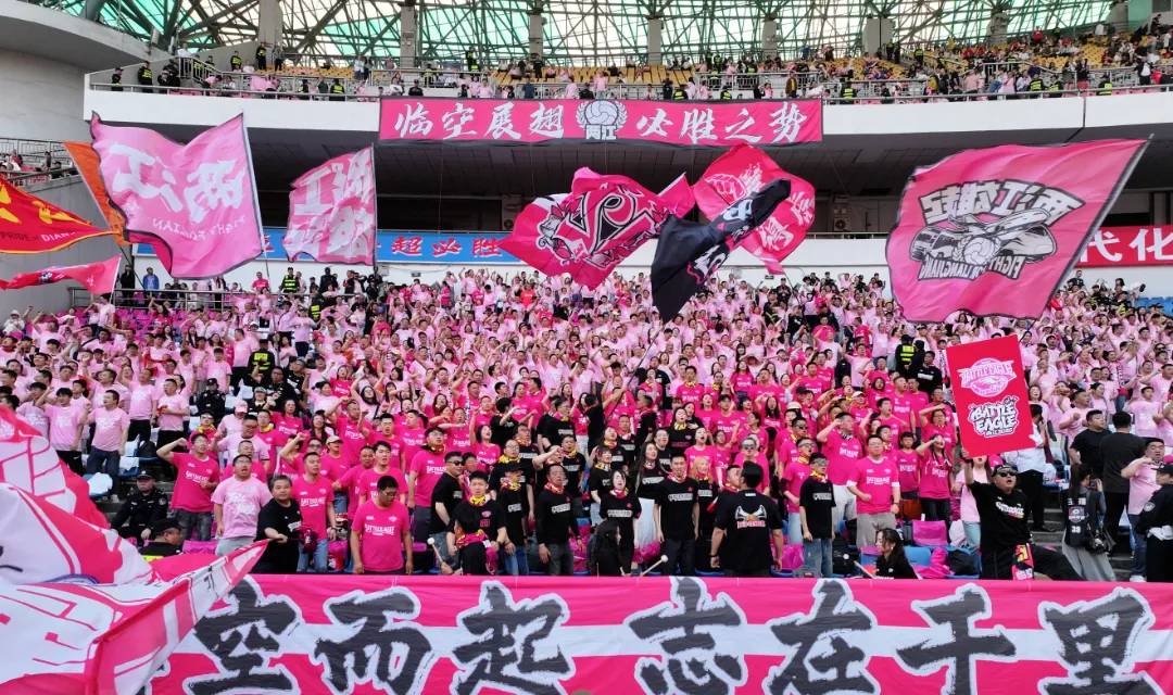 斜对面看台上,身穿粉色球衣的两江临空队球迷不断挥舞旗帜,以最饱满的热情,最终见证了球队夺得冠军。