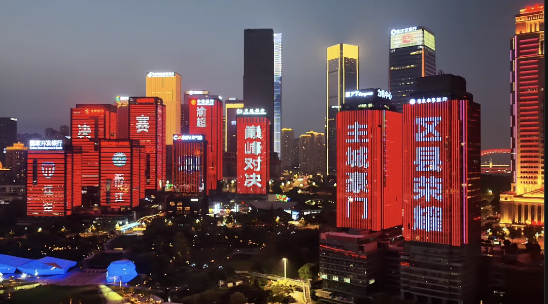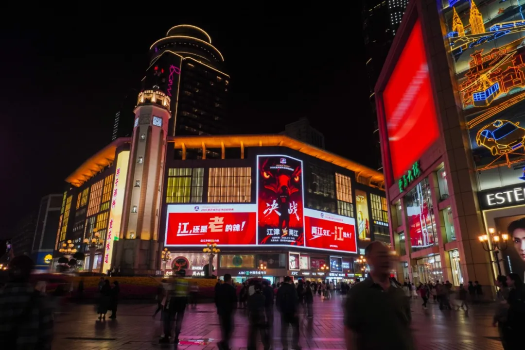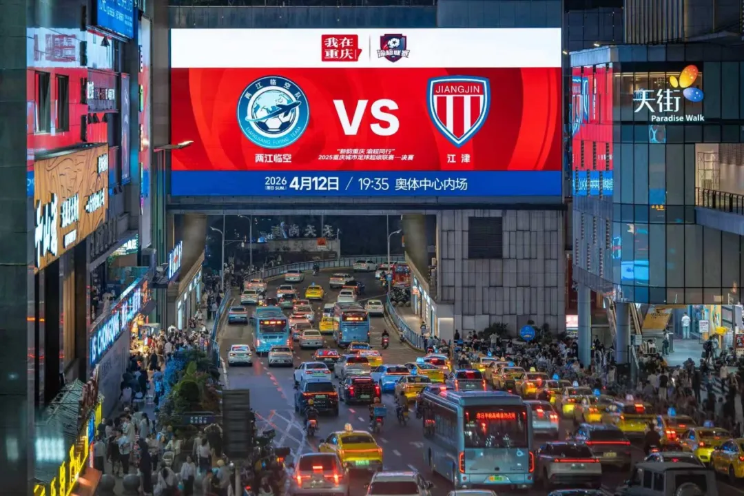 决赛前夜,江北嘴“十连屏”、观音桥“我在重庆”、解放碑“重庆之翼”、万象城巨幕同步点亮渝超广告,整座山城为这场草根足球盛宴同频共振。