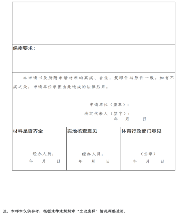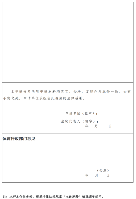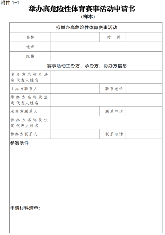 1.申请书。申请书应当包括体育赛事活动的名称、时间、地点、规模、主办方、承办方、协办方、参赛条件等内容;
