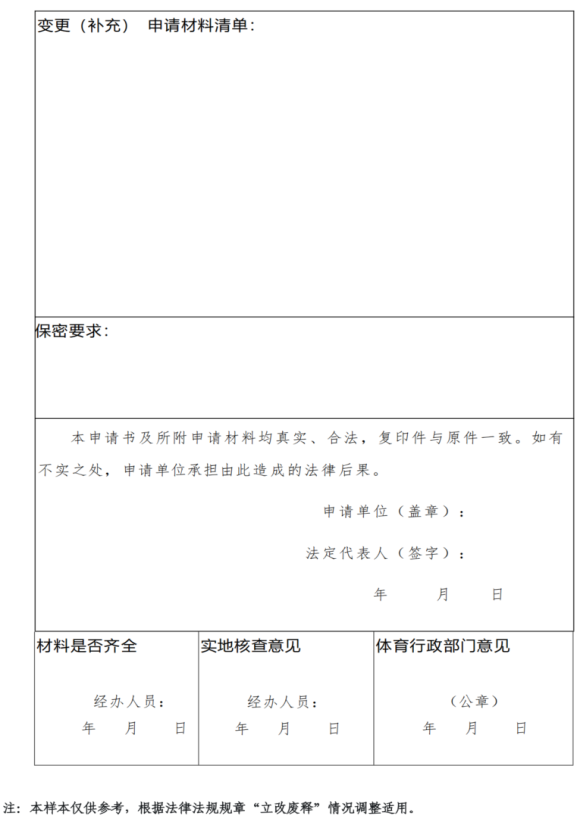 体育行政部门对申请人提交的申请材料进行审查,材料不齐全或者不符合法定形式的,应当当场或五日内一次性告知申请人需要补正的全部内容;材料齐全、符合法定形式的,予以受理。