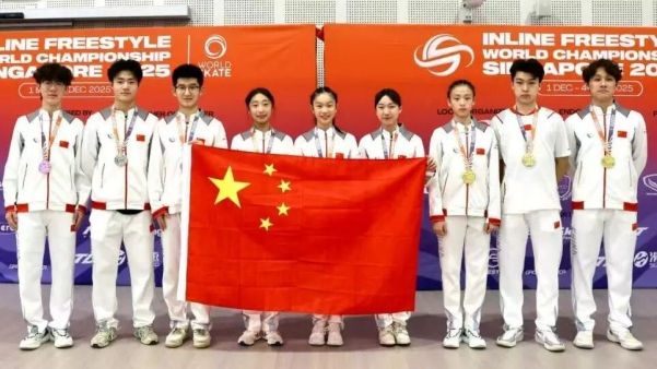 近日,2025年世界自由式轮滑锦标赛在新加坡举行,本次比赛共有来自32个国家和地区的370名运动员参赛。沙坪坝小将许小小代表中国队在青年女子组花式绕桩项目和花式对抗项目中斩获冠军, 蝉联3届世锦赛花式绕桩冠军。(供稿人:张曙升)