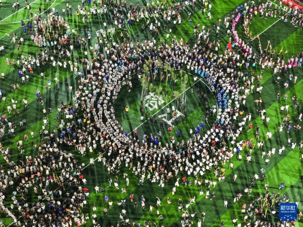 2025年8月23日,人们在贵州“村超”球场跳苗族芦笙舞(无人机照片)。新华社记者 杨文斌 摄