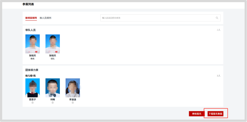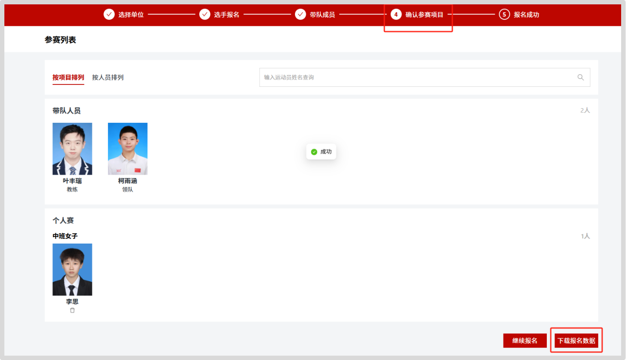 (五)点击“确认参赛项目”,在列表中检查所有参赛信息无误后,点击“下载报名数据”,可下载报名excel存档。