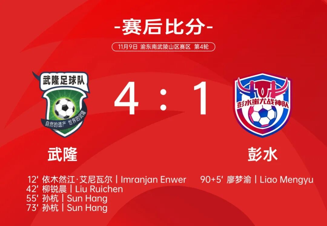 11月9日,渝超联赛共有两场对决,分别是渝东南武陵山区赛区的武隆VS彭水、渝东北三峡库区赛区的巫山VS城口。最终,武隆4:1大胜对手,巫山则与城口0:0互交白卷。
