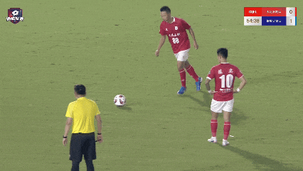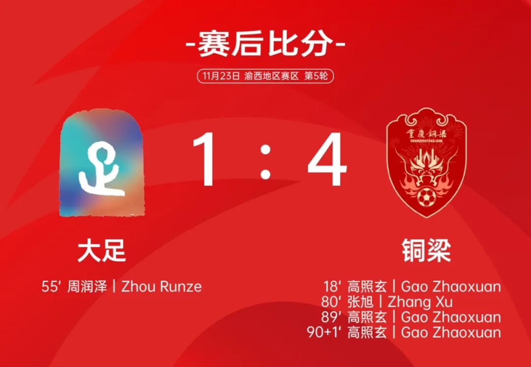 第55分钟,大足获得禁区前沿的直接任意球机会,80号球员兼教练张远杰左脚射门击中右侧立柱,9号周润泽跟进后轻松推射空门得手,将比分扳平。
