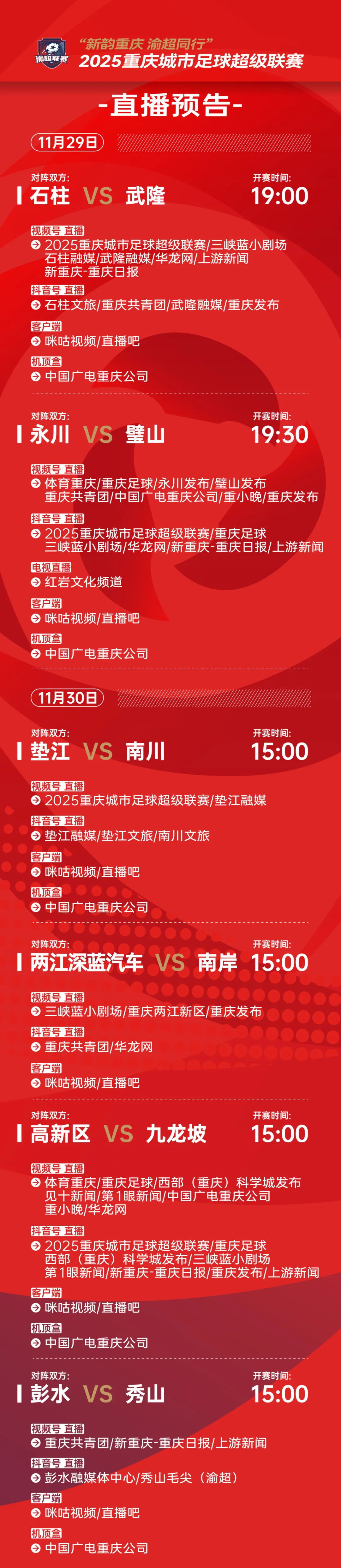 直播预告 | 2025重庆城市足球超级联赛(11.29-11.30)