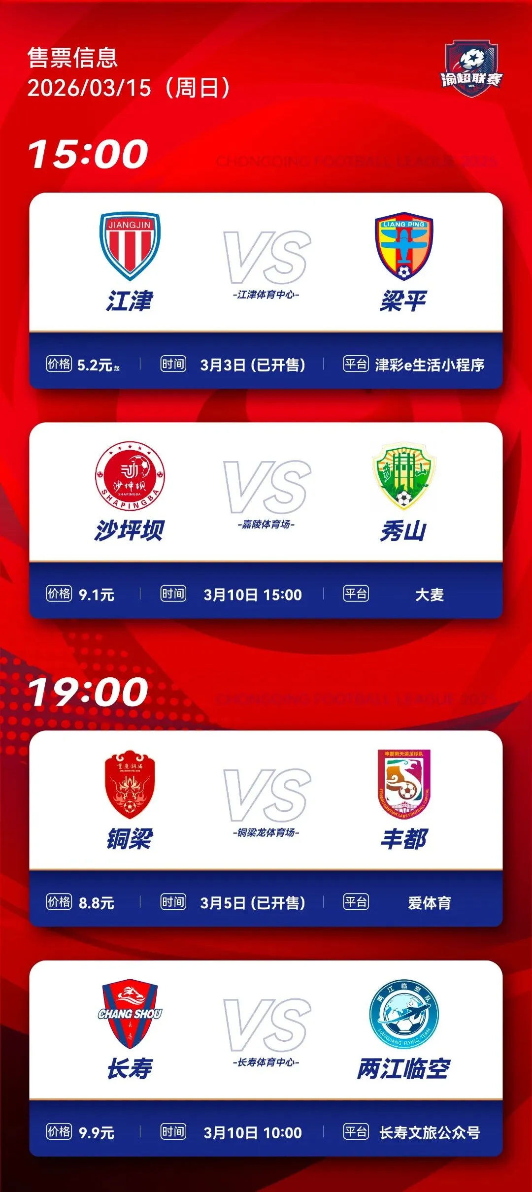 渝超联赛八强赛战火将于3月15日重新点燃!经过各大赛区的层层激战,最终脱颖而出的八支劲旅,即将向最高荣耀发起全力冲击。巅峰对决一触即发,精彩不容错过!目前,各球队的球票已陆续开售,广大球迷朋友们可根据官方发布的售票信息进行购票观赛。