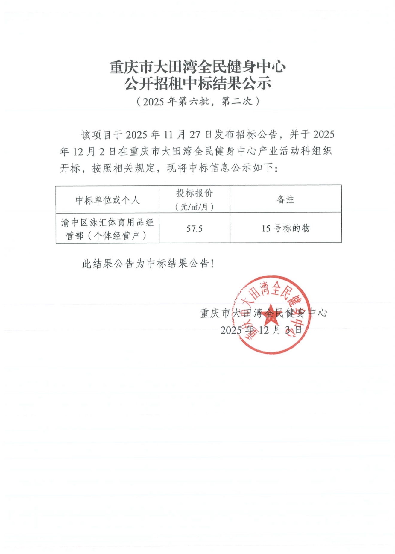 重庆市大田湾全民健身中心物业公开招租中标结果公示(2025年第六批,第二次)
