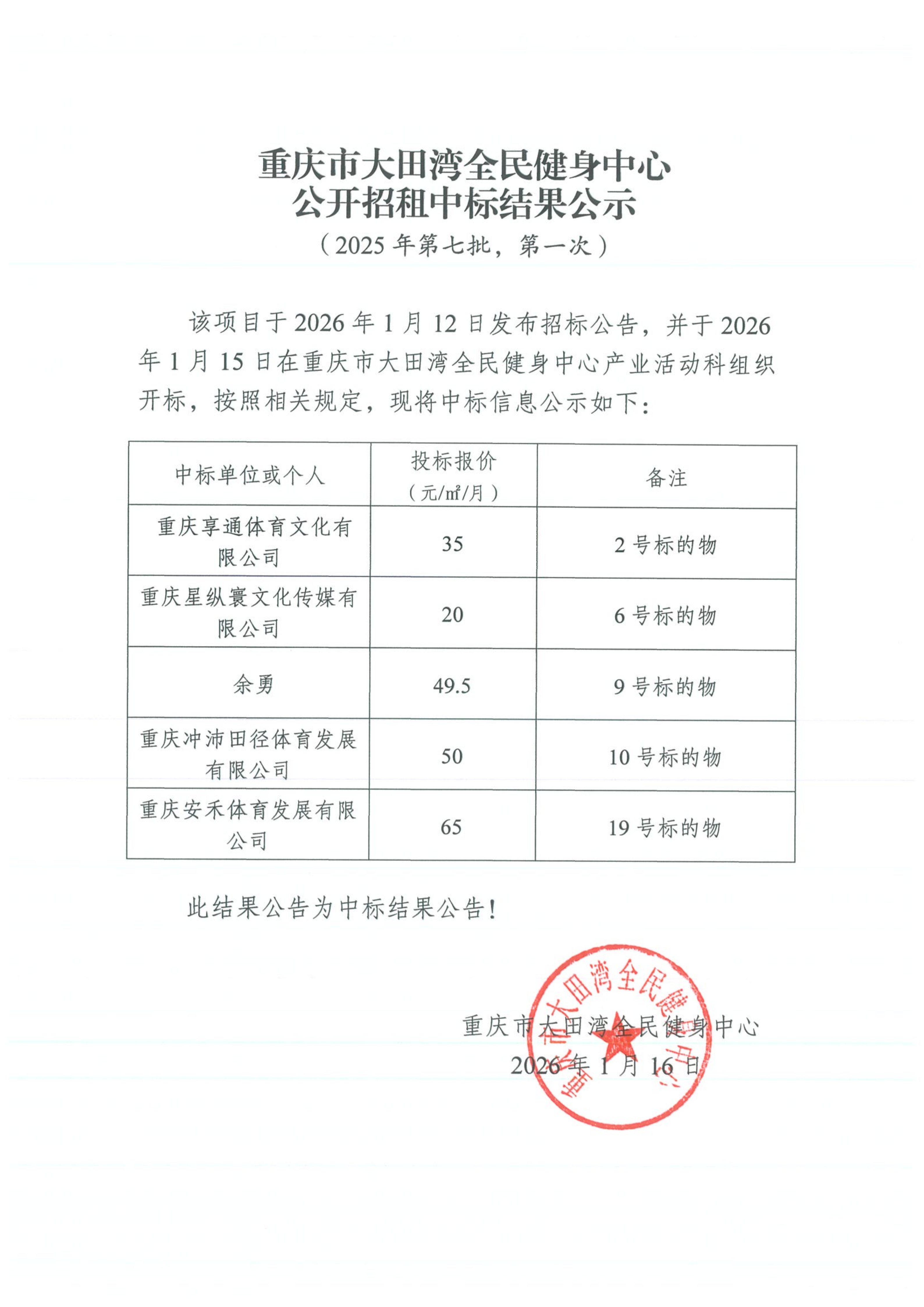重庆市大田湾全民健身中心物业公开招租中标结果公示(2025年第七批,第一次)