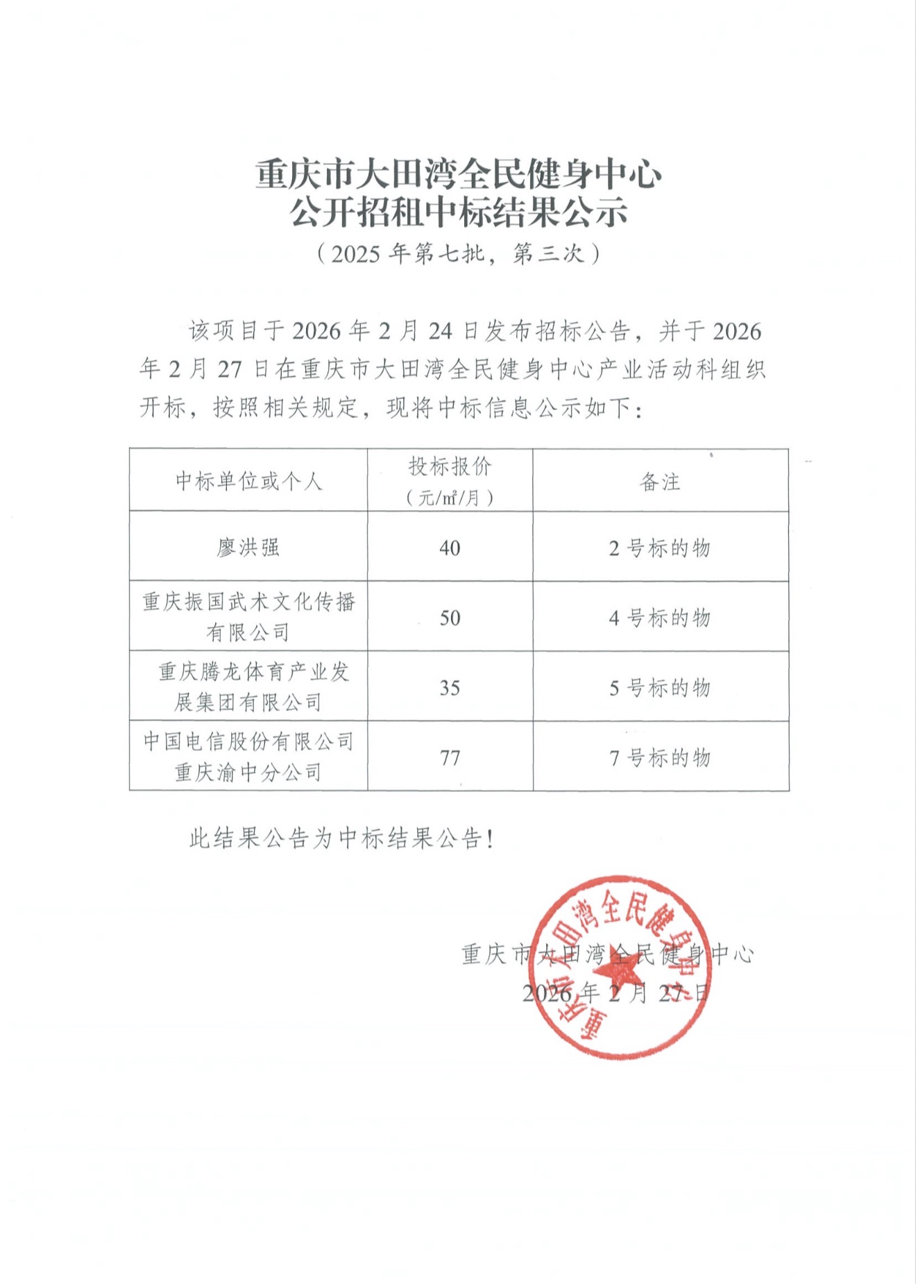 重庆市大田湾全民健身中心物业公开招租中标结果公示(2025年第七批,第三次)