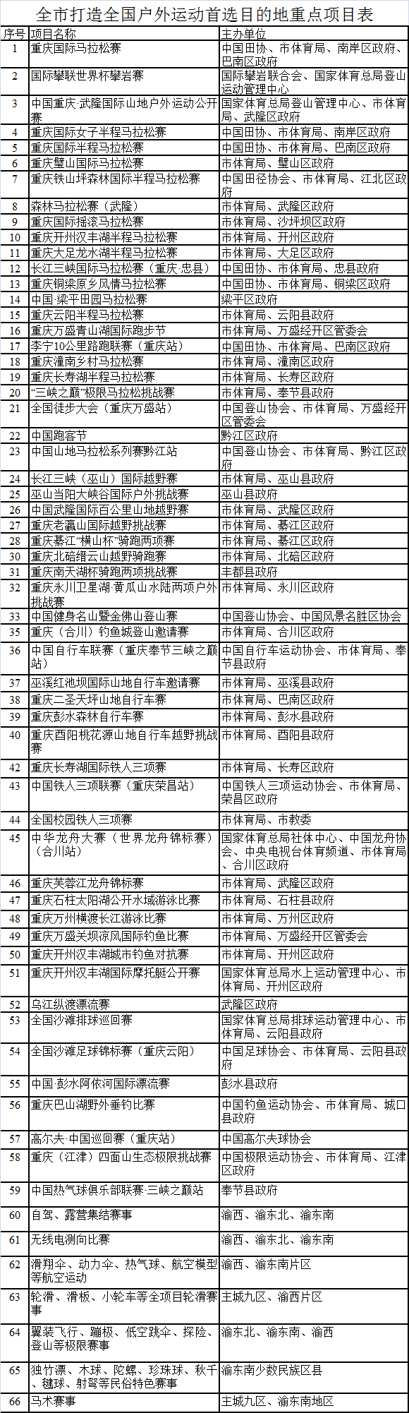 重庆市体育局副局长张欣告诉记者,国际国内户外品牌赛事包括马拉松、山地户外赛事、自行车、铁人三项、龙舟、攀岩、水上运动、高尔夫、山系、汽车自驾、定向、马术等户外项目,5个户外体育旅游示范区则包括了全域体育旅游•万盛示范区、武陵山区户外运动•武隆示范区、都市体育旅游示范区、三峡库区体育旅游示范区、现代时尚体育旅游•龙兴示范区。除此之外,重庆还将大力发展群众身边的户外运动,加快建设群众身边的户外运动设施、普及群众身边的户外运动项目、推动线上和线下户外运动发展、大力支持户外运动产业发展。